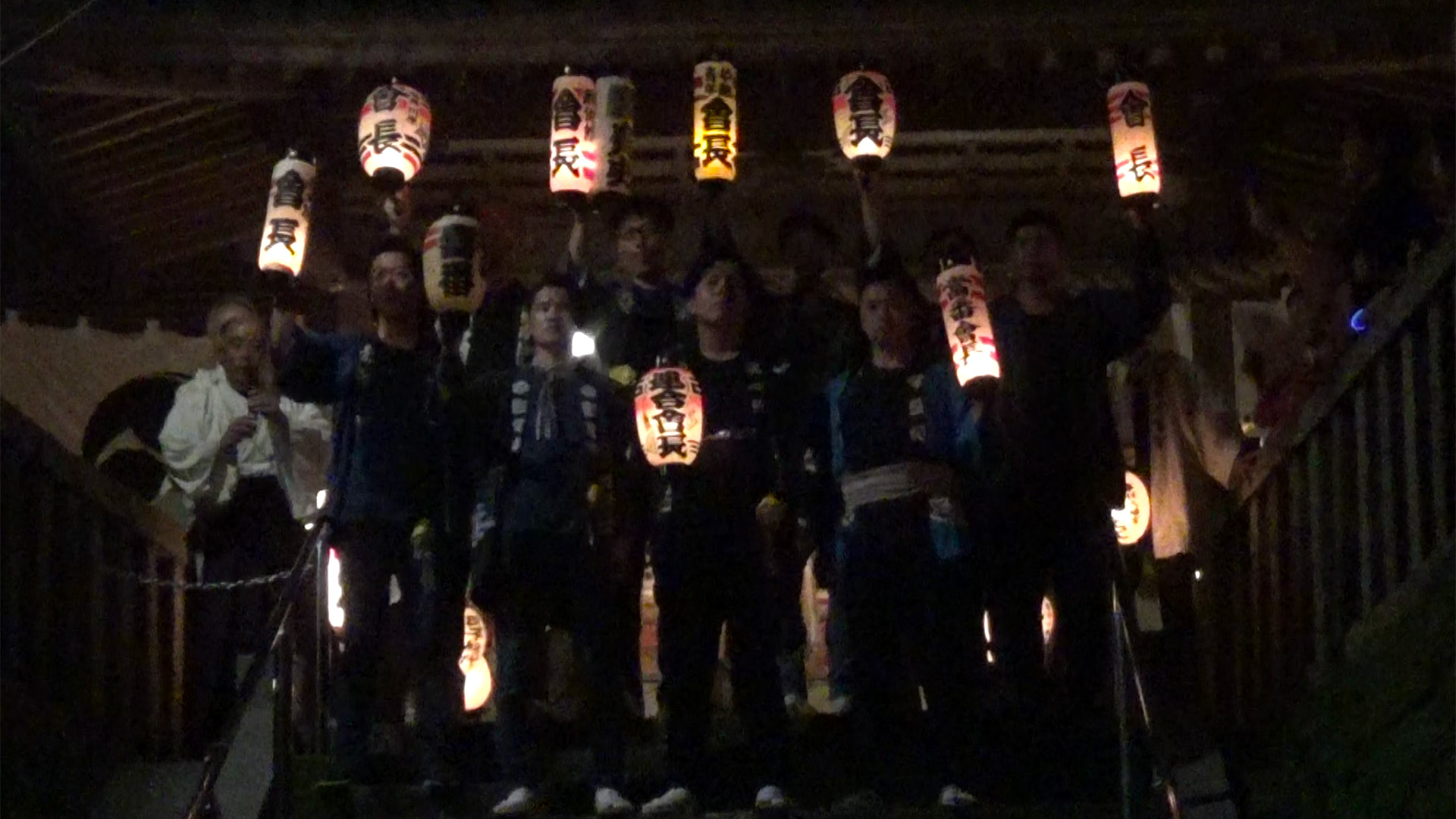 祭典2日目には、禰里が各町内の会所に立ち寄りお囃子と手古舞を披露する「役まわり」という儀式が行なわれていました。この役まわりでは「昇殿」「鎌倉」「四丁目」というお囃子が手古舞と共に披露され、この日にしか観られない貴重なものであるとのことです。最終日の3日目は夕方から出向き、夜祭りを取材。メイン通りを参加13町内の禰里(ねり)が曳き廻され、沿道は多くの見物客でごった返していました。メイン通りを曳き廻された禰里は、やがて三熊野神社へ… 千秋楽を迎えます。